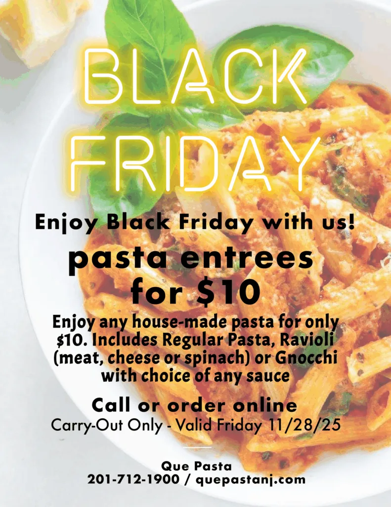 Our signature dishes are crafted from scratch every day. From velvety gnocchi and creamy fettuccine Alfredo to perfectly layered lasagna, our menu is built on quality ingredients and time-honored recipes. If you’re searching for homemade pasta in Saddle Brook, Que Pasta is your place.